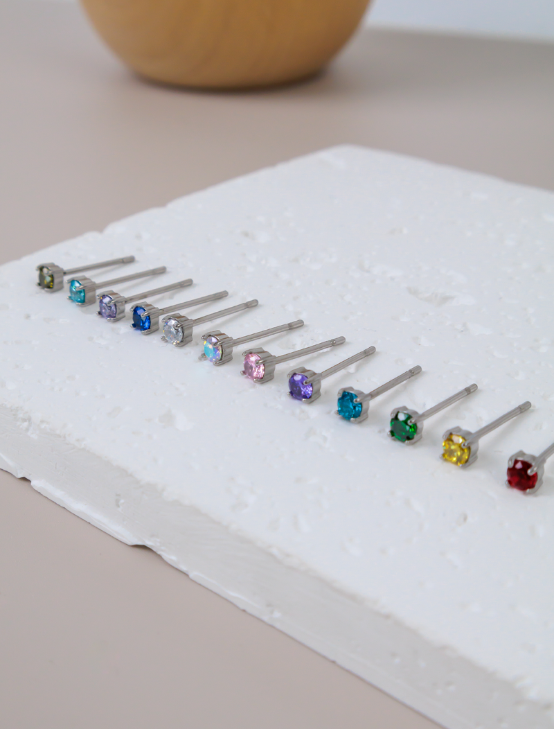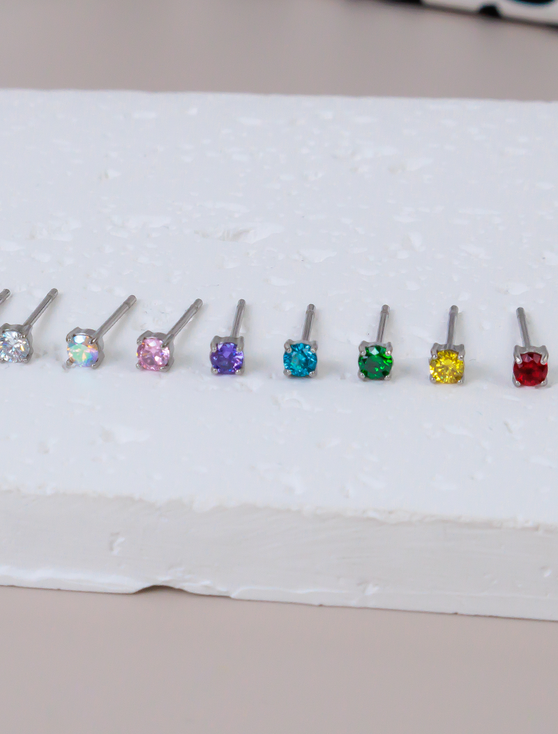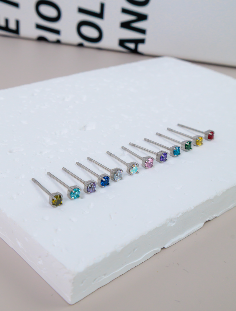 商品材質 : 鈦鋼(親膚低敏)/鍍18K金(高保色)/鋯石/低敏鋼針/銀色/多色販售(1月紅色/2月深紫/3月天藍/4月白色/5月深綠/6月彩色/7月淺紫/8月橄欖綠/9月寶藍/10月粉紅/11月黃色/12月海藍)